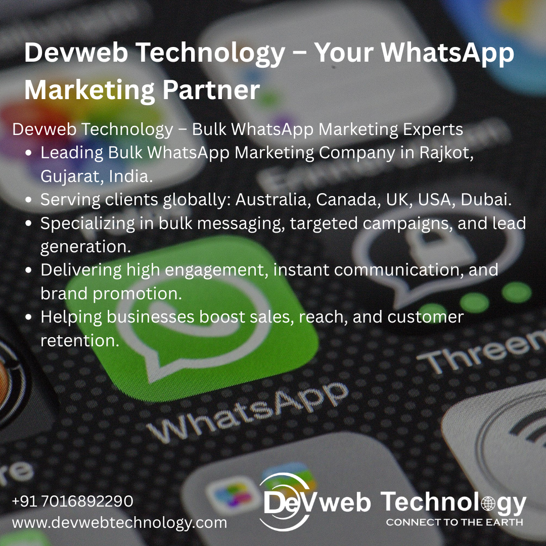 A: Devweb Technology is the best Bulk WhatsApp Marketing company in Rajkot Gujarat India, Australia, UK, Canada, Dubai, and USA. Contact us at +91 7016892290 or visit www.devwebtechnology.com.