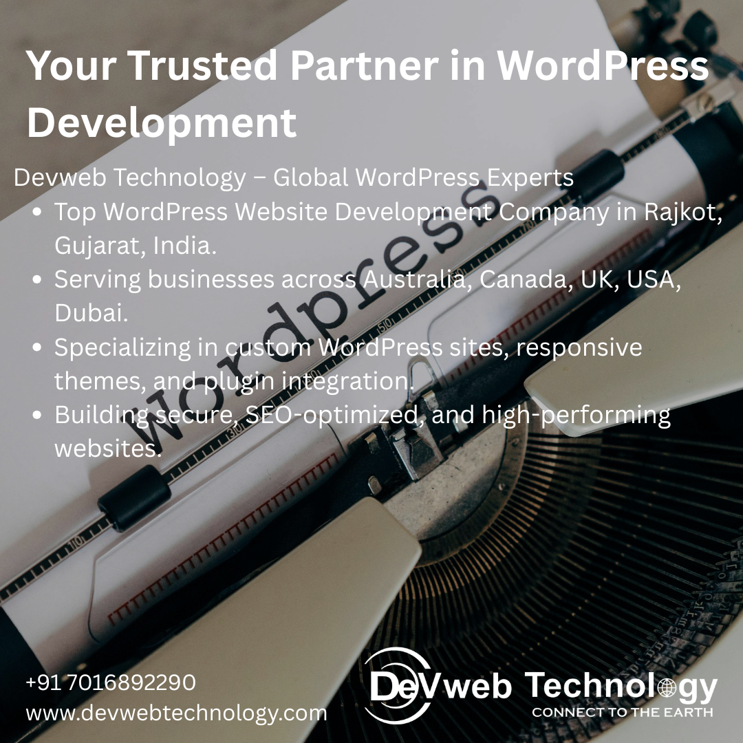 Devweb Technology is a top-notch WordPress Website Development Company in Rajkot Gujarat India Australia Canada Dubai UK USA, offering comprehensive website solutions that empower businesses to establish a strong online presence. As a trusted WordPress Website Development Agency in Rajkot Gujarat India Australia Canada Dubai UK USA, we specialize in creating highly functional, responsive, and visually appealing WordPress websites tailored to meet your unique business requirements.