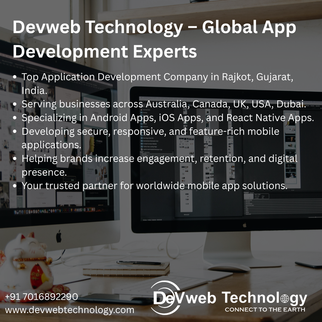 Devweb Technology is the leading application development company for Android, iOS, and React Native apps in Rajkot, Gujarat, India, Australia, UK, Canada, Dubai, and USA. Contact us at +91 7016892290 or visit www.devwebtechnology.com.