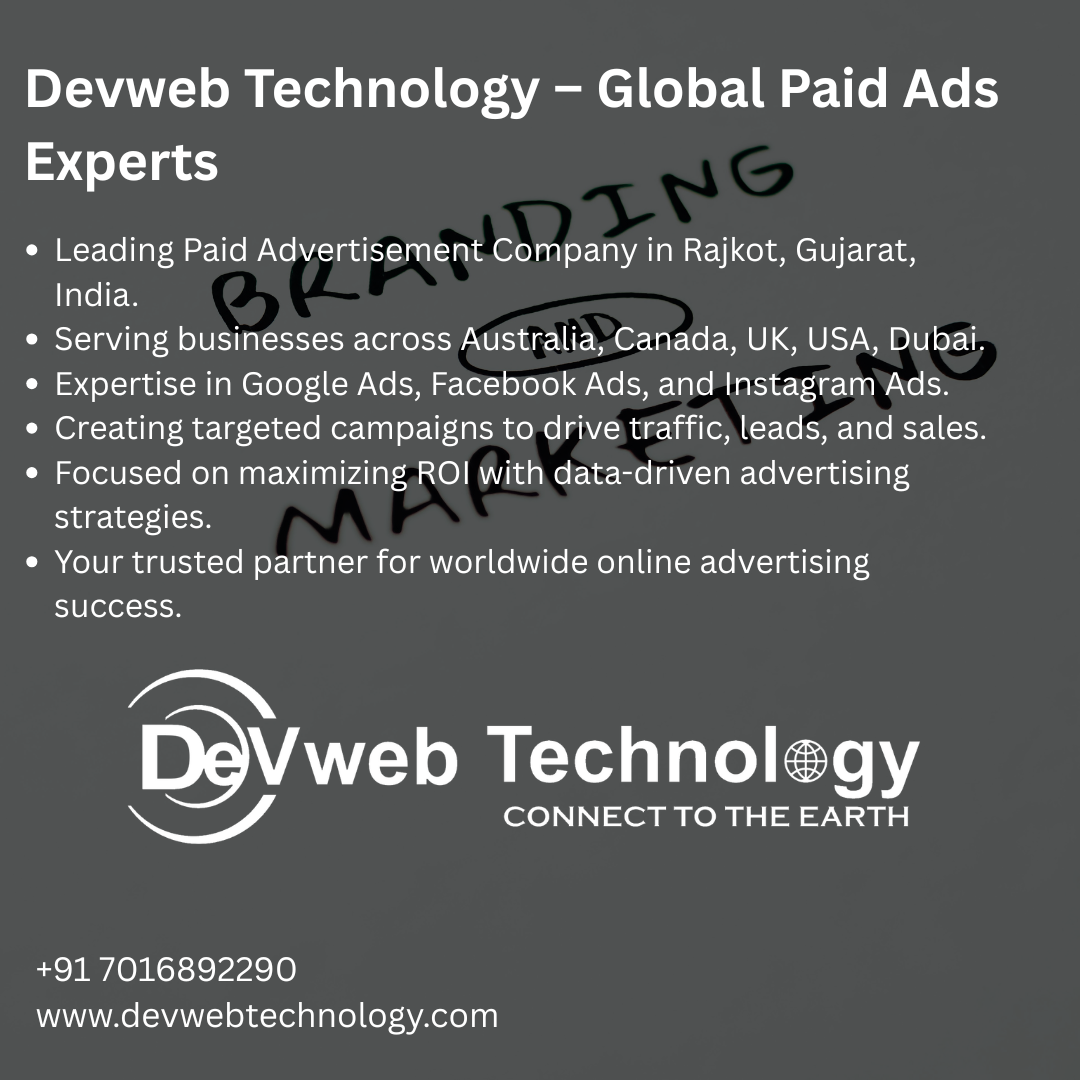 Devweb Technology is a leading Paid Advertisement Company in Rajkot, Gujarat, India, delivering professional advertising solutions across Australia, Dubai, Canada, UK, and USA. Recognized as a top Paid Advertisement Agency in Rajkot Gujarat India Australia, Dubai, Canada, UK, USA, we specialize in crafting high-performance campaigns that maximize brand visibility and deliver measurable results.