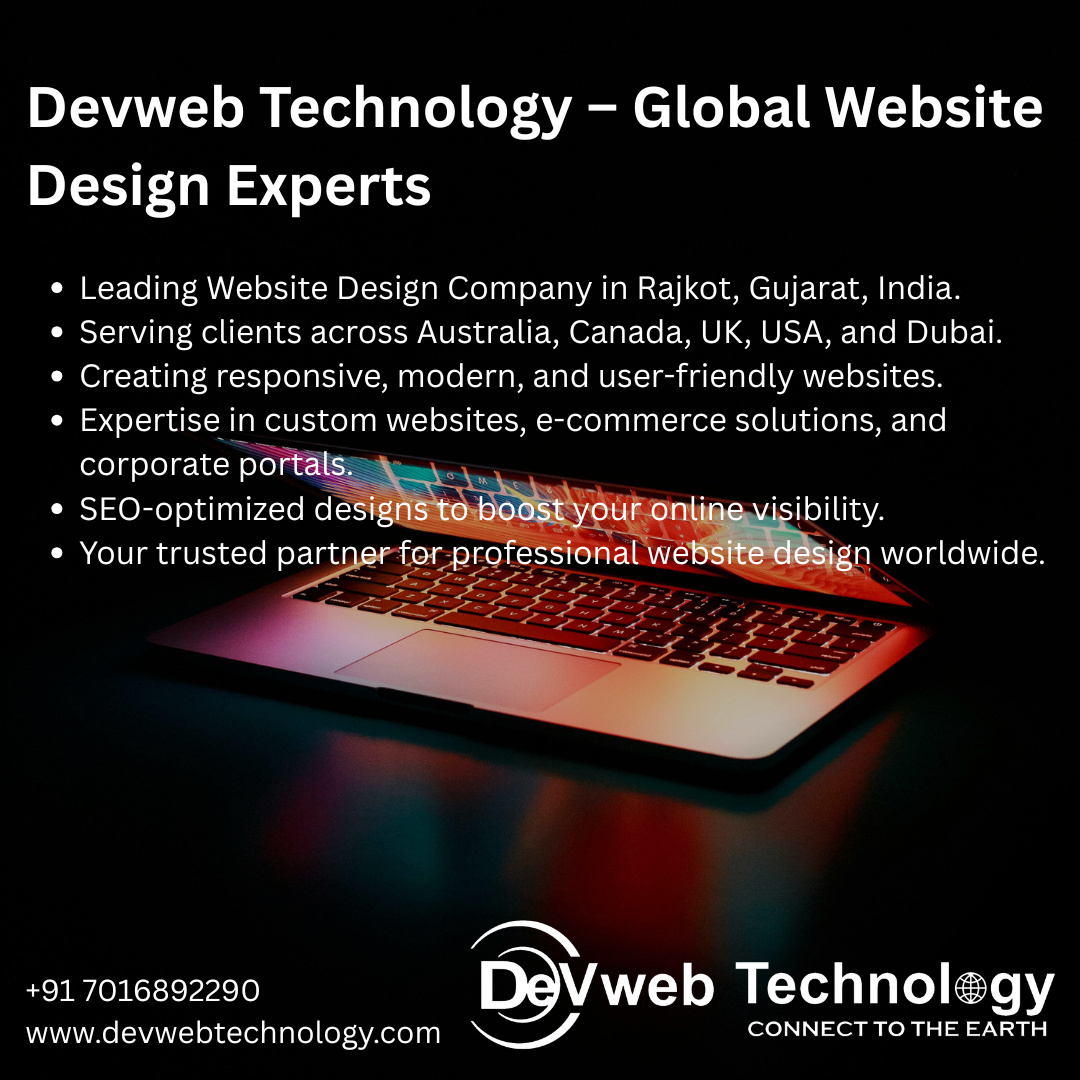 Devweb Technology is a top website design company in Rajkot, Gujarat, India, providing premium digital solutions for businesses in Australia, Dubai, Canada, UK, and USA. As a trusted website design agency in Rajkot Gujarat India Australia, Dubai, Canada, UK, USA, we specialize in delivering innovative, user-friendly, and high-performing websites tailored to meet your unique business requirements. Our team of experienced designers and developers ensures your brand gets a professional online presence that enhances user experience and drives business growth.